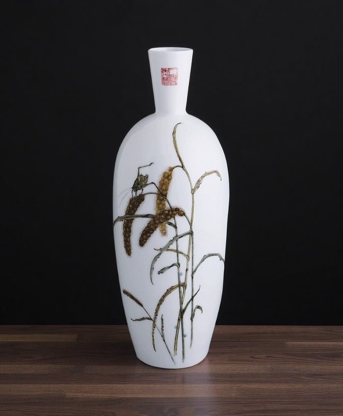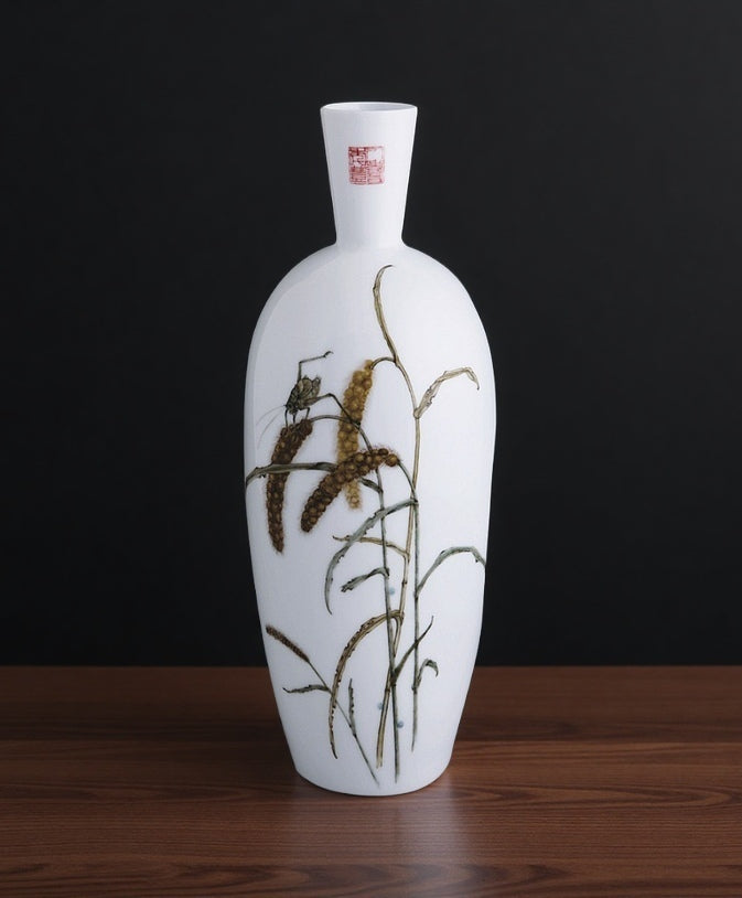 Autumn Imagery: Against a pristine white canvas, golden millet stalks cascade like a rain of abundance, each grain meticulously detailed. A lifelike katydid clings to the stalks, its delicate antennae poised as if ready to take flight—infusing stillness with vitality.