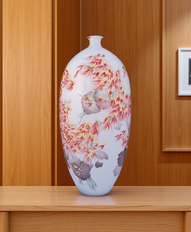 Its tall, narrow-neck silhouette complements both modern and classical interiors—ideal for study rooms, lobbies, or display cabinets. The soft white glaze amplifies the rich autumn palette, casting refined elegance.