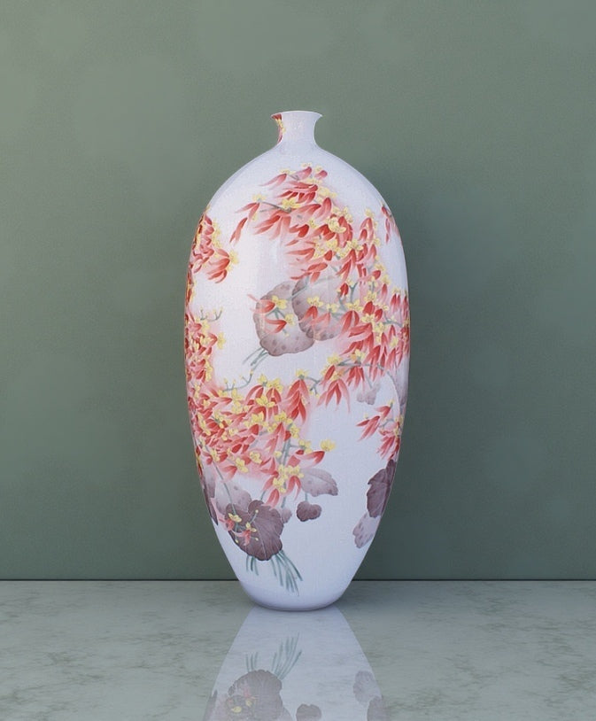 Standing at 60cm tall, this slender vase captures the poetic essence of autumn through the ancient art of National Intangible Cultural Heritage—Underglaze Five-Color Porcelain. Master Huang Xiaoling transforms pristine white porcelain into a canvas of seasonal beauty: fiery maple leaves cascade in gradient hues, delicate yellow blossoms reveal intricate stamen details, and deep purple banana leaves drape gracefully with fine veining. Each stroke embodies centuries of ceramic craftsmanship, while the vibrant colors—fired at 1380°C—become eternally preserved autumn light.