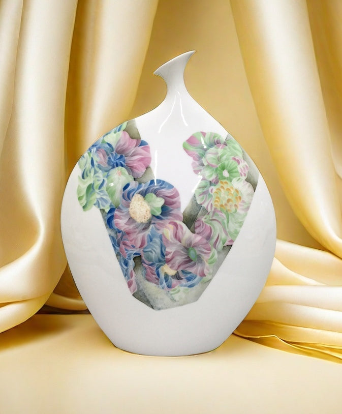 The standout design element is a bold, irregular "window" cutout on the vase, revealing a vibrant hand-painted floral motif in soft pastel blues, pinks, purples, and greens, accented with delicate yellow centers. The watercolor-like petals spill over the edges, creating a striking contrast against the luminous white porcelain. Fired at 1380°C, the colors remain eternally vivid, making this piece a timeless fusion of functional art and collectible craftsmanship.