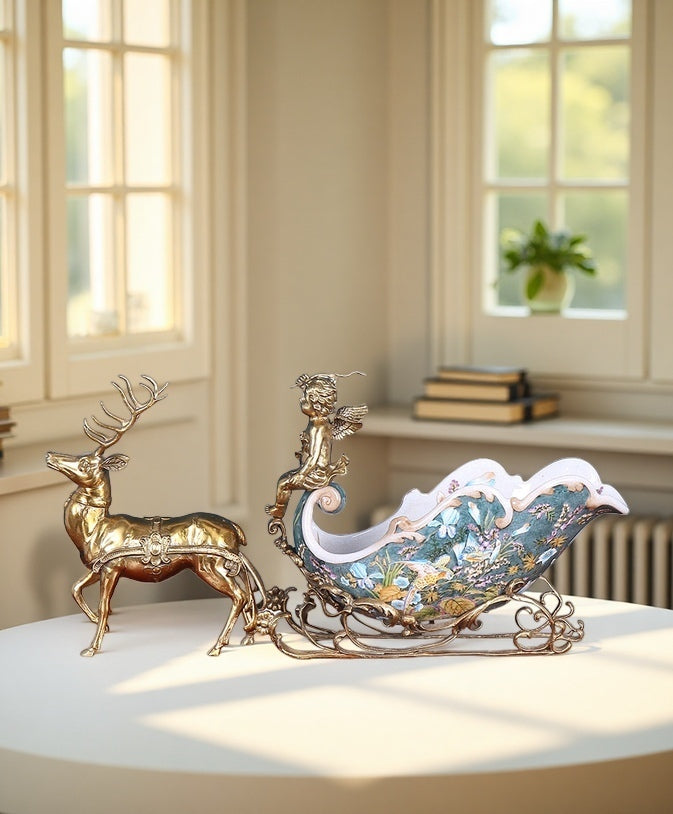 Inspired by the 18th-century French court’s obsession with "Chinoiserie," this Deer-Drawn Sleigh Wine Rack recreates the allure of Chinese porcelain art once treasured in the Palace of Versailles during Louis XVI’s reign. Crafted from high-temperature ceramic with a jade-like finish and gilded pure copper antlers and wheels, the sleigh features a charming winged cherub—reminiscent of Queen Marie Antoinette’s private collection of Oriental sculptures—infusing contemporary interiors with a 300-year-old artistic legacy.