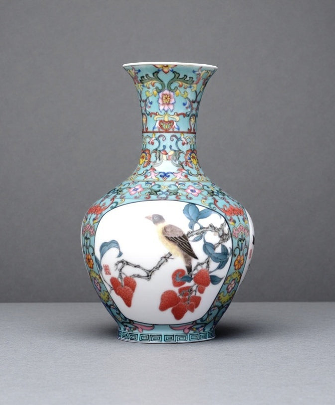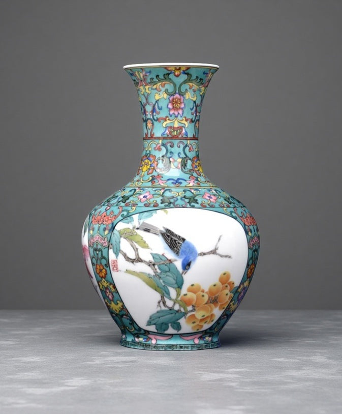 This pair of vases is a masterpiece by ceramic artist Yi Gangli, crafted using the national intangible cultural heritage technique of Underglaze Five-Color Porcelain. Standing at 22 cm in height, the vases feature a vibrant turquoise-blue glaze as the base, adorned with intricate floral motifs. The unique "window" design on the belly frames meticulously painted scenes of birds perched on fruit-laden branches, creating a vivid, three-dimensional painting effect.