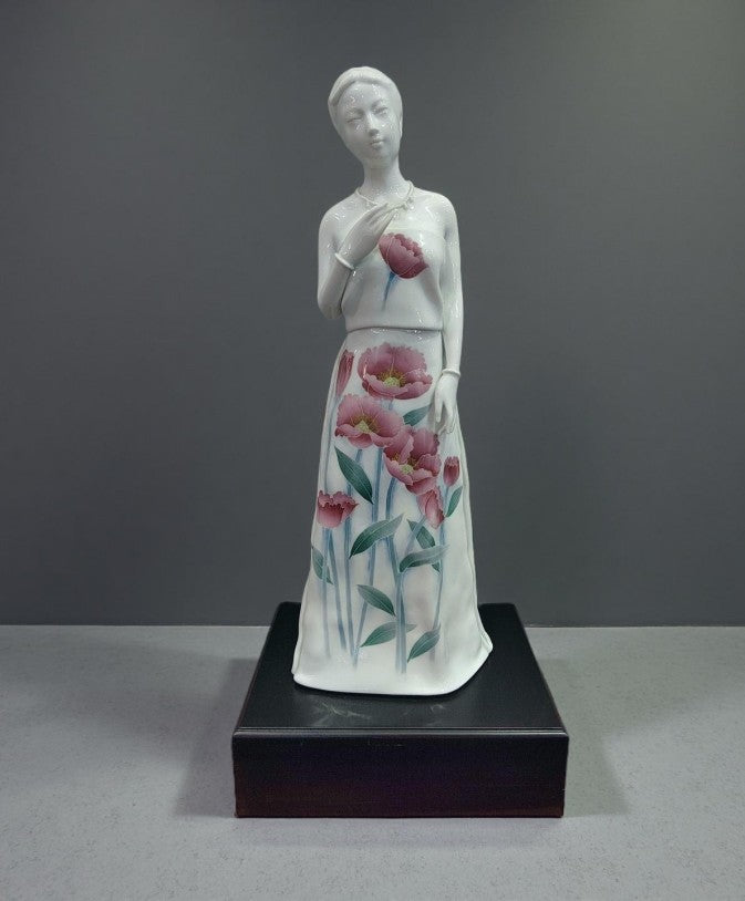 Standing at 55cm in height, the figurine embodies graceful posture: one hand gently rests near the chest, while the other falls naturally, with flowing robes reminiscent of wind brushing through willow leaves. The dress is adorned with underglaze five-color paintings of vibrant pink flowers and green leaves, whose brilliance remains eternally vivid through high-temperature firing. The pure white porcelain texture and smooth sculpted lines capture the subtle elegance and vitality of an Eastern lady.