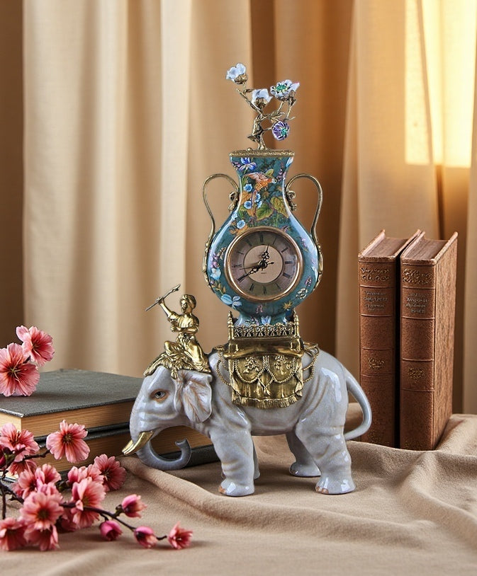 Inspired by the 18th-century European "Chinoiserie" craze, the [Parrot Famille Rose] Elephant Clock Sculpture masterfully blends Eastern and Western artistry. The centerpiece is a high-fired ceramic elephant in pristine white, adorned with a gilded figure seated atop, holding an ornate object—exuding regal elegance. Above rests a turquoise-blue famille rose vase, intricately painted with floral motifs and lively parrot designs, crowned by delicate hanging blossoms and a vintage-style clock at its center. With grand dimensions of 32×13.5×56 cm, this sculpture commands attention as a striking statement piece.
