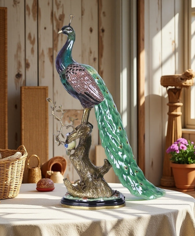 Inspired by the 18th-century "Chinoiserie" trend that swept the Palace of Versailles, this peacock sculpture features a body crafted from high-temperature ceramic, adorned with intricately carved copper details, and perched atop a ceramic tree-stump base. The peacock’s neck showcases a gradient glaze of blue and green, while its tail feathers unfold like an emerald screen, with wing textures rendered with lifelike delicacy—echoing the Eastern charm sought by Louis XVI for the porcelain portrait of Emperor Qianlong commissioned for Queen Marie Antoinette. Measuring 36×17×60.5 cm, its scale mirrors the precious artifacts displayed in the study of Versailles, blending the artistry of the Qianlong era with the romantic imagination of Rococo style.