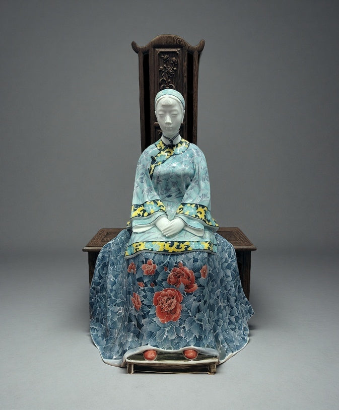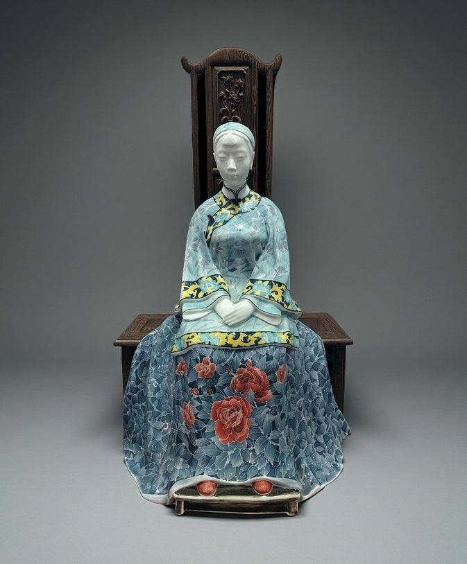 This artwork, titled "Gentle Lady," is a porcelain sculpture meticulously created by Chinese Master of Arts and Crafts Nie Lei. It employs the nationally recognized intangible cultural heritage technique—Underglaze Five-Color Porcelain—combining traditional sculpting methods with contemporary aesthetic expression. The piece measures 54cm in height, 32cm in length, and 25cm in width. It depicts a graceful woman from the Republican era seated on a wooden chair, poised and serene. She wears a blue cheongsam adorned with intricate yellow and blue patterns and vibrant red blossoms, showcasing rich layers of color and refined elegance. The work embodies both classical Eastern charm and the unique artistic appeal of underglaze five-color porcelain.
