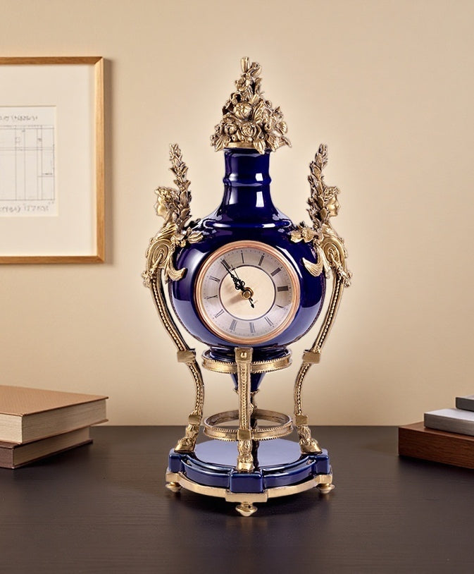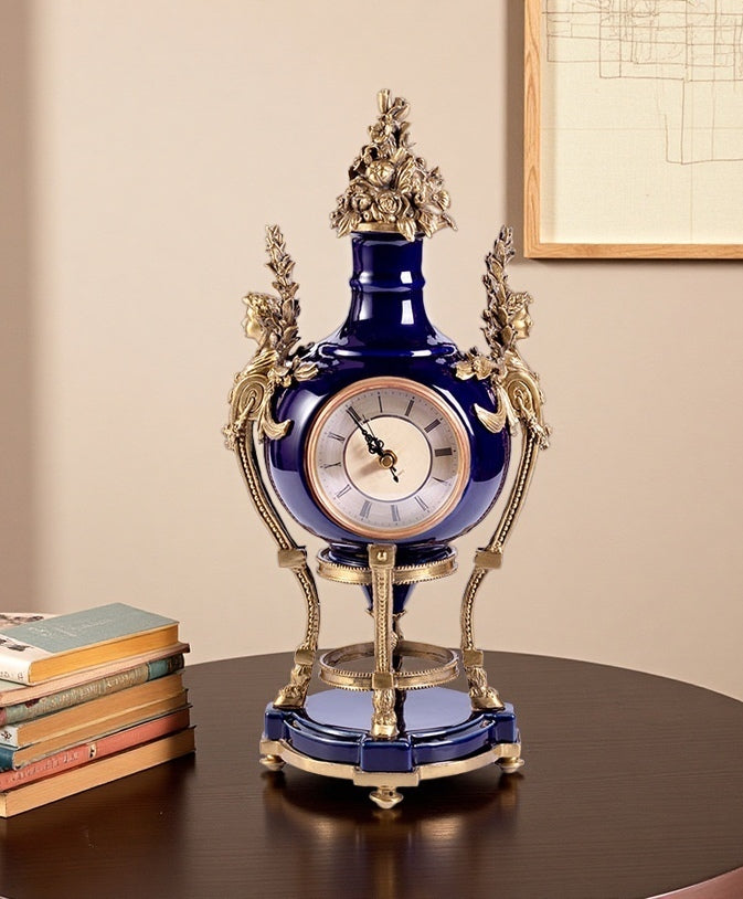 Inspired by the 18th-century "Chinoiserie" craze that swept Versailles—where Queen Marie Leszczyńska adorned her chambers with blue-and-white porcelain and Louis XVI commissioned a portrait of Emperor Qianlong—this mantel clock embodies the opulent dialogue between Eastern and Western artistry. Crafted from high-temperature ceramic, its deep sapphire glaze shimmers with the translucent brilliance of classic Chinese porcelain, while intricate gilt bronze accents—featuring Baroque scrollwork and cherubic figures—evoke the grandeur of French royal décor.