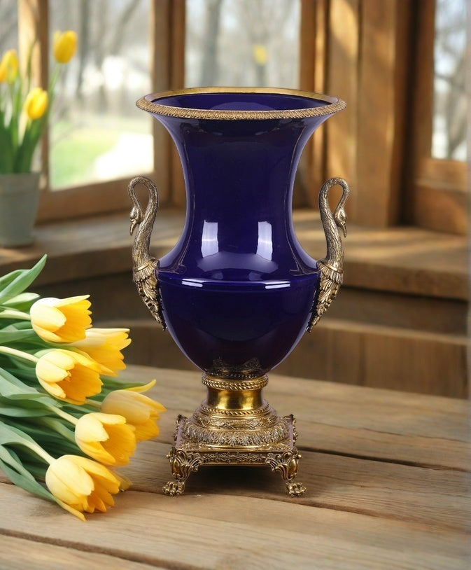 Inspired by the 18th-century French court’s fascination with "Chinoiserie," the Sapphire Blue Swan Decorative Vase blends Eastern ceramic artistry with Western metallic craftsmanship, reviving the artistic dialogue adored by Versailles nobility. Crafted from high-temperature ceramic with a deep, jewel-like glaze, it features a gilded copper base and elegant swan-shaped handles—embodying the refinement of Chinese blue-and-white porcelain while embracing the opulence of Baroque European design. Measuring 34×28×58 cm, this majestic vase commands attention as a centerpiece, with every detail narrating the legendary fusion of Eastern and Western aesthetics.