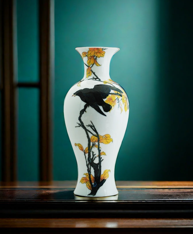 Handcrafted by renowned Chinese ceramic artist Liu Jinsong, this exquisite vase showcases the ancient art of Intangible Cultural Heritage [Underglaze Five-Color Porcelain]. The pristine white glaze serves as a canvas, where a spirited magpie perches gracefully on gnarled branches, its jet-black plumage contrasting vividly with russet-red leaves. Captured mid-song, the magpie seems to herald autumn’s bounty, embodying the traditional symbolism of "good fortune at your doorstep." Standing at 45cm, this vase is a harmonious blend of artistic mastery and auspicious charm, bridging centuries-old craftsmanship with contemporary aesthetics.