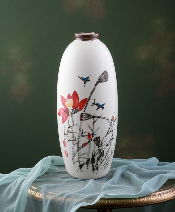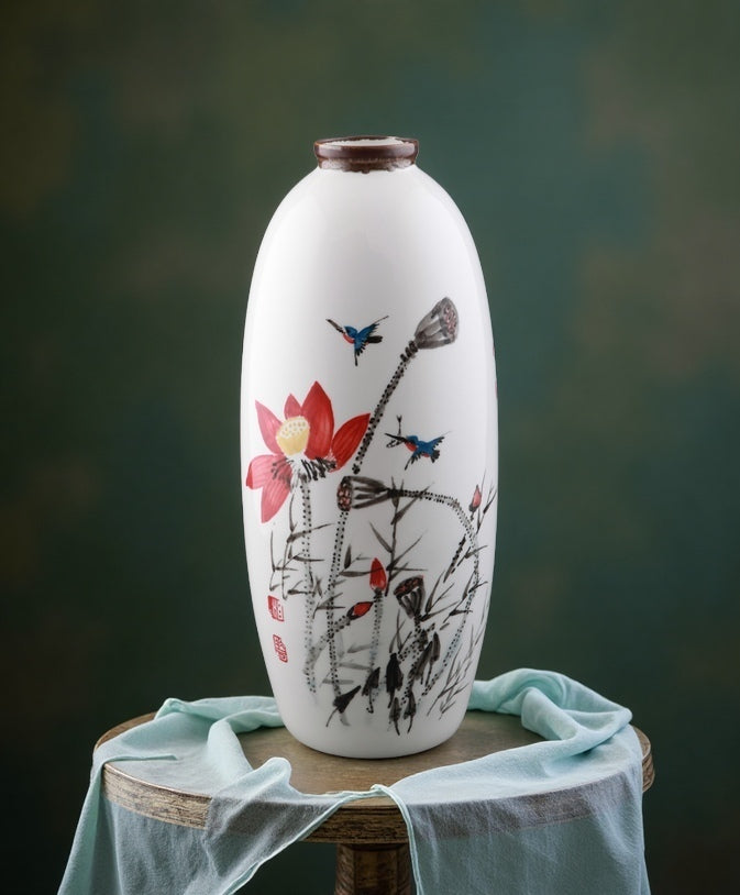 This exquisite underglaze five-colors porcelain masterpiece by Master Deng Wenke features a pristine white ceramic body adorned with a hand-painted Chinese motif. A vibrant red lotus in full bloom takes center stage, accompanied by sturdy seed pods, slender stems, and two kingfishers in mid-flight—rendered in striking blue with reddish-orange chests. The composition balances meticulous detail with expressive ink-brush strokes, embodying the harmony of traditional "hua niao" (flower-and-bird) painting and ceramic artistry. Fired at 1380°C, the colors remain eternally vivid, making this a true "painting on porcelain" for the ages.