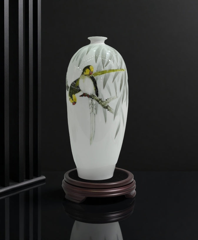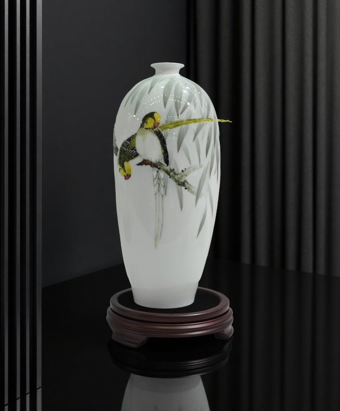 Created by renowned Chinese ceramic artist Li Huangxiang, the "Willow Shade"small-mouth vase combines the intangible cultural heritage technique of underglaze five-color porcelain with the artistry of traditional ink wash painting. The vase, standing at 35cm tall, features a pristine white ceramic body adorned with an exquisite scene: two vividly colored birds perched on a slender branch, their feathers rendered in bright hues of yellow, white, and greenish-black, with subtle red accents on their beaks and feet. Delicate willow leaves, painted in soft grey-green strokes, frame the composition, embodying the essence of classical Chinese ink wash aesthetics.